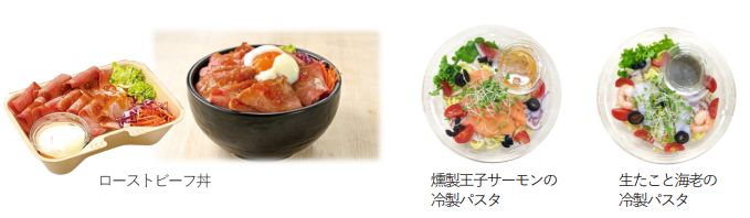 「弁当・麺」カテゴリーでは、健康を軸に商品を開発した。ローストビーフ丼のご飯は「雑穀⽶・もち⻨・⼗六穀」を使⽤し、ローストビーフと相性の良いソースを選定した。パスタでは、タコ・サーモン・エビなど海産物を使⽤し、食べ応えのある商品に仕上げた。
