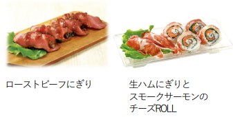 「寿司」カテゴリーでは肉の旨みを味わえるよう、ローストビーフを大きくスライスしたローストビーフにぎりをつくった。北海道産⽟ねぎ使⽤のソースで味付けしている。