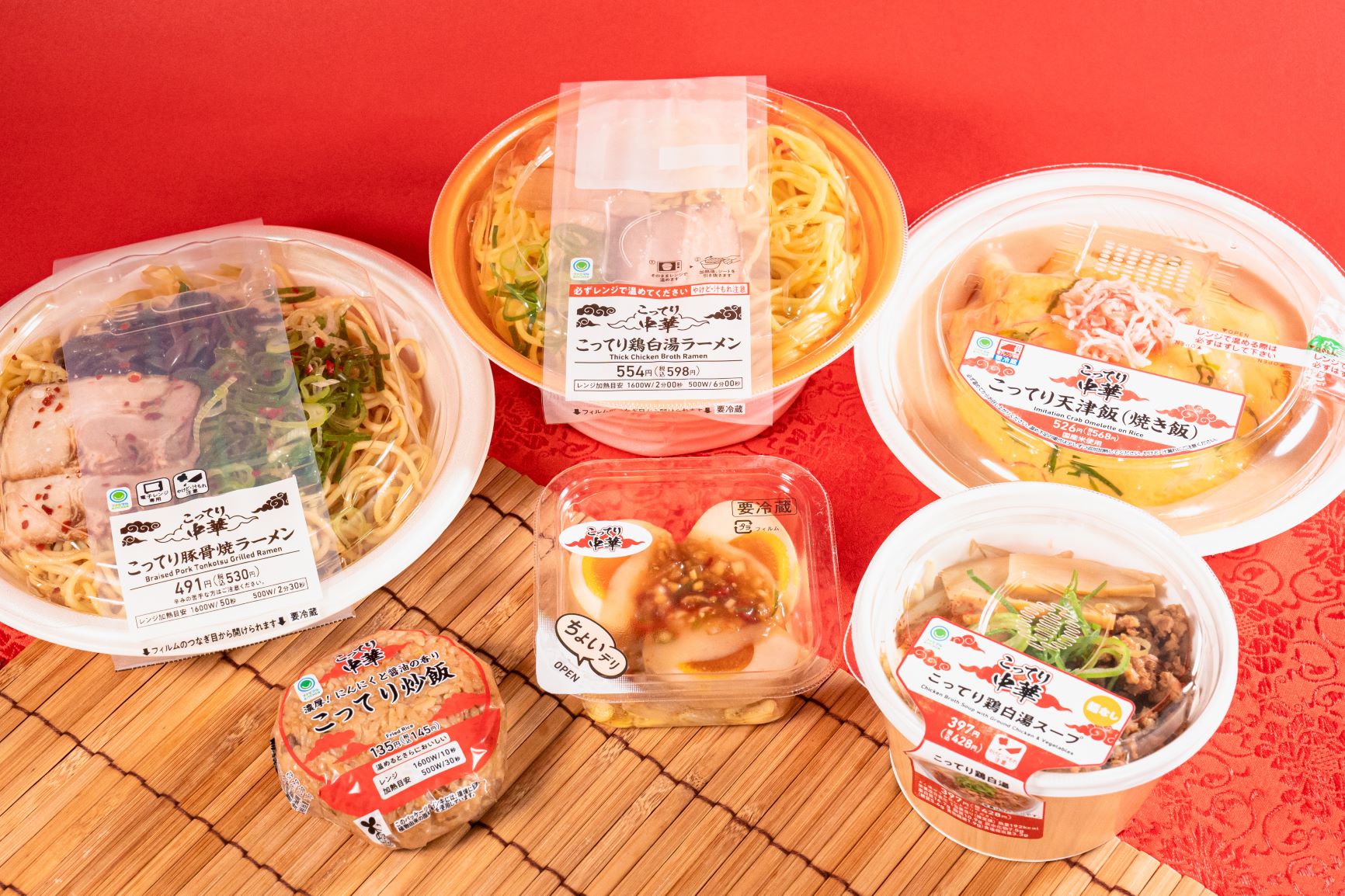 商品は、「こってり炒飯おむすび」135円(税別、以下同)、「こってり天津飯(焼き飯)」526円、「こってり鶏白湯ラーメン」554円、「こってり豚骨焼ラーメン」491円、「こってり鶏白湯スープ」397円、「こってりだれの味付けたまご」276円の6品。