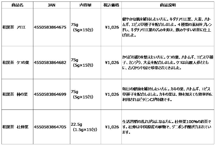 商品は和漢茶アロエ、クコの葉、柿の葉、杜仲葉の4種類。東洋の考え方に基づき、様々なハーブや植物などで作られている。価格は税込みで各1026円。