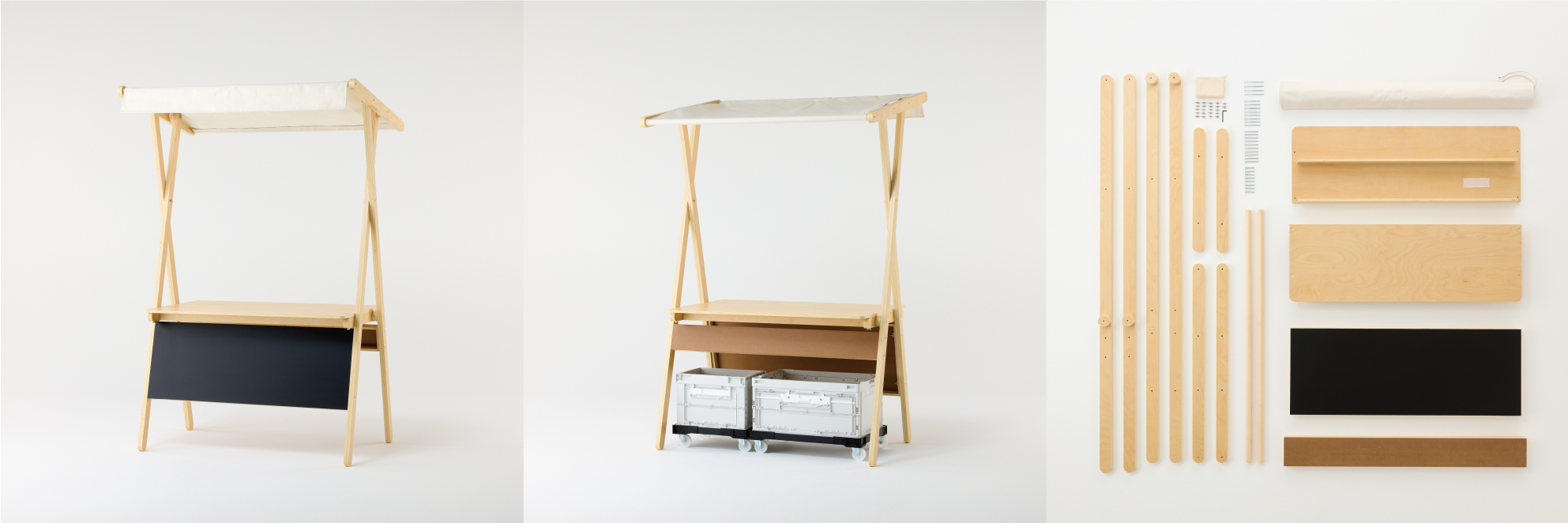 簡易設置できる「木製屋台什器」(9万9000円)は、イベントやマルシェ・ワークショップを行う際に簡単に組み立てして使用できる、木製の屋台。