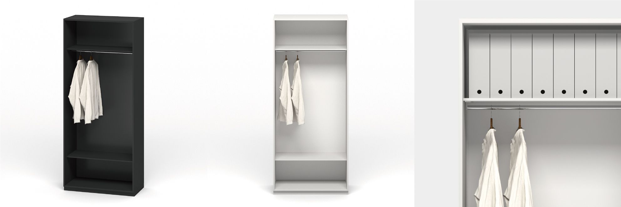 棚を増やせば書庫にもなる「スチールロッカー ワードローブセット」(7万5000円)は、高さのあるボックス型のワードローブ。人数の増減に合わせて棚を追加することで、書庫に変えることもできる。