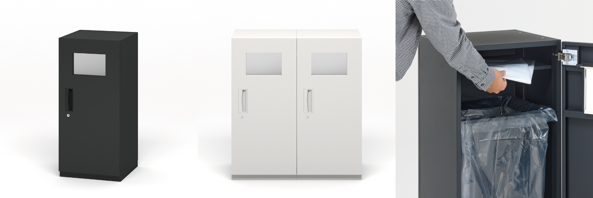 「スチールダストボックス フラップ扉付き」(6万5,000円~)は、臭いが漏れにくいよう、フラップ扉がついた大容量のダストボックス。本体は横方向に連結することができるので、オフィスのゴミ回収ルールに合わせて拡張できる。中のリングに直接ゴミ袋を引っ掛けることで、内側をフル活用でき、ゴミの回収もしやすい。容量はリング使用で「約90L」、ボックス使用で「約60L」。