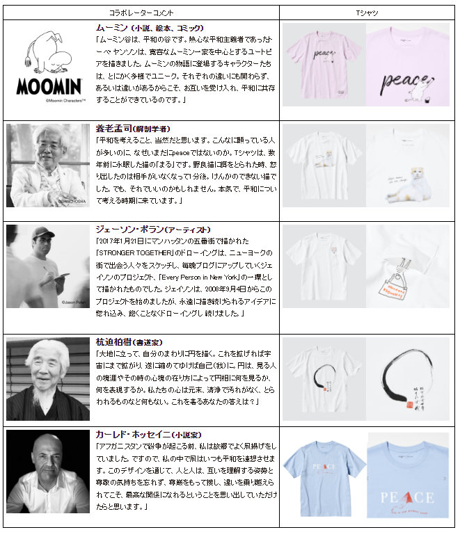 春夏コレクションは全5柄で、誰もが知る愛くるしいキャラクターのムーミンが、ピンクのTシャツをキャンバスに、力強く「PEACE」の文字を筆書きする姿が描かれている。著書『バカの壁』で知られる解剖学者の養老孟司氏は、愛猫「まる」の写真に「Hope means we can change」という言葉を添え、平和への願いを表現。その他、ニューヨークのアーティスト、ジェイソン・ポラン氏、書道家、杭迫柏樹氏、アフガニスタン出身で国連難民高等弁務官事務所(UNHCR)親善大使を務める元難民のアメリカ人小説家、カーレド・ホッセイニ氏のデザインも登場する。