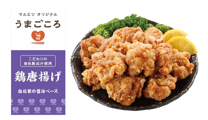 その第一弾として、3月7日(木)から「うまごころ」の第1号商品「自社製出汁と3種醤油の鶏唐揚げ」(100g当たり208円、以下同)をマルエツ、マルエツ プチ、リンコスの全店で販売する。