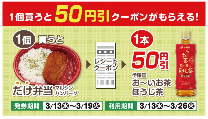 また「だけ弁当(マルシンハンバーグ)」の新発売を記念して、3月13日(水)~3月19日(火)まで、「だけ弁当(マルシンハンバーグ)」を買うと「伊藤園 お~いお茶ほうじ茶」に使える50円引きレシートクーポンを発券する。