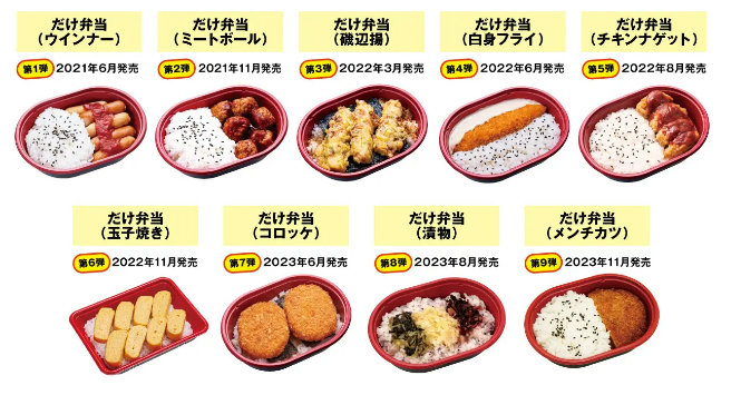 同社は2021年6月から、「弁当には色とりどりのおかずが入っているべき」という常識を覆し、「好きなものだけを堪能したい」というニーズに応える弁当として、あえて1種類におかずを絞った超シンプルな弁当シリーズ「だけ弁当」を1個200円(税抜き)で販売している。