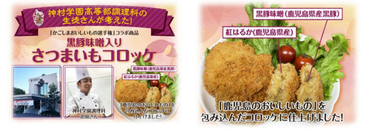 また3月16日(土)11:00~15:00には、イオン鹿児島店(鹿児島市東開町7)で、神村学園高等部調理科の学生が、自ら「黒豚味噌入りさつまいもコロッケ」の魅力を伝えながら販売する。