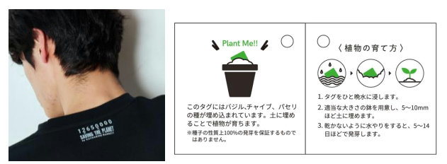 新デザインは、イオンがこれまで植樹した苗木の累計本数「12,650,000」をTシャツの首元にプリントしている。タグは、再生古紙にハーブの種(バジル、チャイブ、パセリ)をすき込んだシードペーパータグを使用 。タグを一晩水に浸けて土に埋めると数日で発芽し、紙の部分は徐々に分解され数ヵ月で土に還る。
