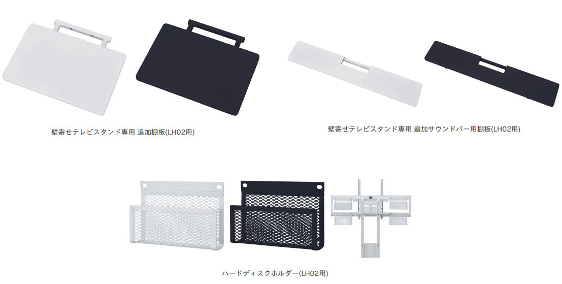 その他、「壁寄せテレビスタンド専⽤ 追加棚板(LH02⽤)」4000円、「壁寄せテレビスタンド専⽤ 追加サウンドバー⽤棚板(LH02⽤)」6000円、「ハードディスクホルダー(LH02⽤)」1500円など、別売りのオプションパーツもある。