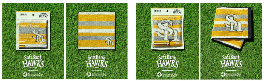 ハンドタオル 637円 / マフラータオル 1819円。チームカラーのイエローとグレーを基調に配色し、ホークスのロゴマークを大きくあしらった、数量限定商品。福岡ソフトバンクホークス商品の発売地域は、福岡県・佐賀県・長崎県・熊本県・大分県・宮崎県・鹿児島県の約1470店舗。