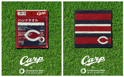 ハンドタオル 637円。チームカラーのレッドを基調に配色し、カープのロゴマークを大きくあしらった、数量限定商品。広島東洋カープ商品の発売地域は、広島県・岡山県・島根県・鳥取県の店舗と山口県の一部店舗限定。