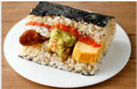 弁当の定番商品「のり弁当」をおにぎりにした商品。ちくわの磯辺揚げ、たまご焼き、白身魚フライ、明太子をご飯ではさんだ。お箸を使わずにおにぎり感覚で食べる「のり弁当」だ。価格は322円(税込み)。4月2日(火)発売。