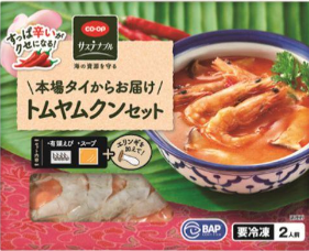 日本生活協同組合連合会(略称:日本生協連、東京都渋谷区、土屋敏夫代表理事会長)は、環境や社会に配慮した主原料を使ったコープサステナブルシリーズから、BAP認証のエビを使用したコープ商品「CO・OP 本場タイからお届けトムヤムクンセット」を4月1日(月)に、「CO・OP レンジで!! ひとくちえび天ぷら」を6月1日(土)に発売する。エビを使用したコープ商品でBAP認証ロゴマークを付けるのは初となる。