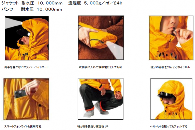 災害時対応フラッシュライトレインスーツと呼ぶもので、ふだん着用してるもので有事対応を想定した商品。強度を備えたPVCコーティングを素材としてい視認性を高めるための袖と裾を色分けしている。また、両手が使えるフラッシュライトフードや自分の存在を伝えるホイッスルを備える。
