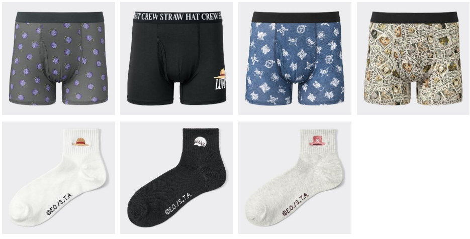 吸汗速乾機能付きで快適な着心地のラウンジウェアや吸汗速乾や抗菌防臭機能付きのスタイルドライボクサーパンツ、ルフィ、トラファルガー・ロー、チョッパーの帽子を刺繍したアンクルソックスなどのアンダーウェアもある。商品は税込価格390円~2990円。