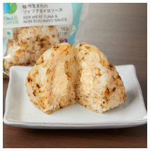 「植物生まれのソイツナ&マヨソース」は、塩こんぶを混ぜたスーパー大麦入りのごはんで、大豆ミートと卵不使用のマヨソースを包んだおむすび。価格は163円。