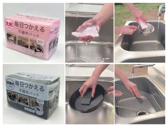 頑固な汚れや油汚れで、洗うスポンジがすぐダメになってしまうという不満を解決するために開発された⼤⼈気の「毎⽇とりかえ・つかえるスポンジ」シリーズに、新しく「毎⽇つかえる洗剤⼊りパッド 30個⼊り」「毎⽇つかえる研磨材⼊りパッド 30個⼊り」が登場した。