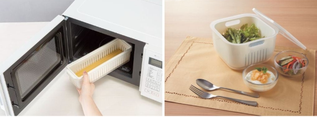 タイプは、サラダスピナーと調味料計量機能を兼ね備えたスピナータイプ「ザルボウル保存容器セット」(期間限定価格 1790円 通常価格 1990円)、パスタの軽量と茹で調理を可能にした⻑⽅形タイプ「ザル付き保存容器セット」(期間限定価格 899円 通常価格 999円)、調味料計量機能つき、⾷器としても使⽤できる正⽅形タイプ「ザルボウル保存容器セット」(期間限定価格 1390円 通常価格 1490円)。