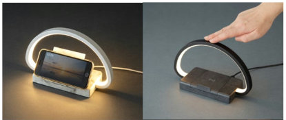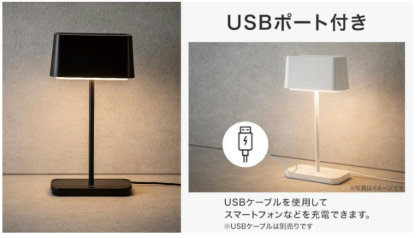 「LEDテーブルランプ」は、台座の側⾯にUSBポートが付いてるので、スマホを充電しながら使⽤が可能。電源ボタン⻑押しで連続調光が可能で、台座部のくぼみには⼩物が置ける。カラーはホワイト、ブラックの2色で価格は3990円(税込み、以下同)。