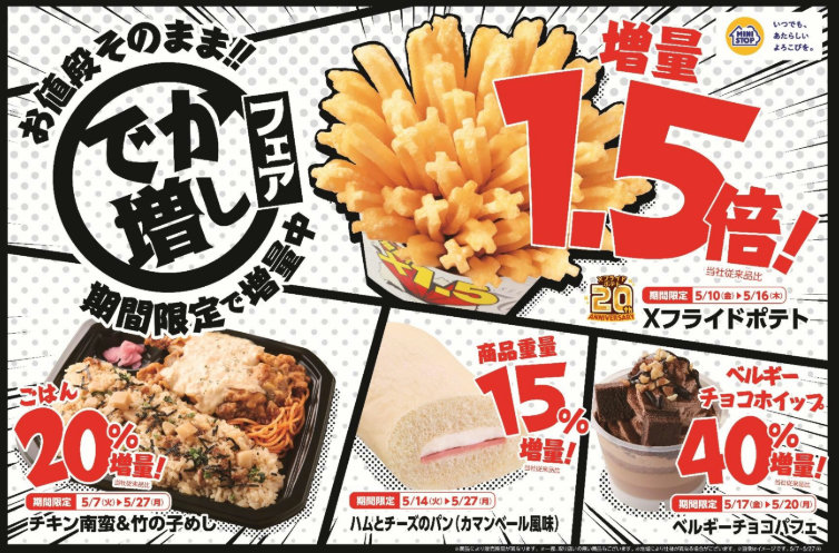 ミニストップ(株)(千葉市美浜区、藤本明裕社長)は5月7日(火)から、ファストフードやおにぎり、スイーツ等のいつもの商品が、値段はそのままで増量する「でか増しフェア」を、全国のミニストップ1831店舗(2024年3月末現在)で期間限定で開催する。