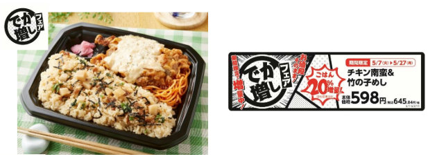 タルタルチキン南蛮と季節ごとに変わるご飯の組み合わせで人気のボリューム系弁当。竹の子めしを20%増量。増量期間は5月7日(火)~5月27日(月)まで。本体価格は598円(以下同)。