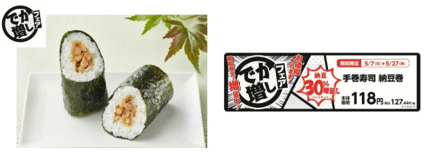 人気定番商品の手巻寿司 納豆巻の納豆を30%増量。増量期間は5月7日(火)~5月27日(月)まで。価格は118円。
