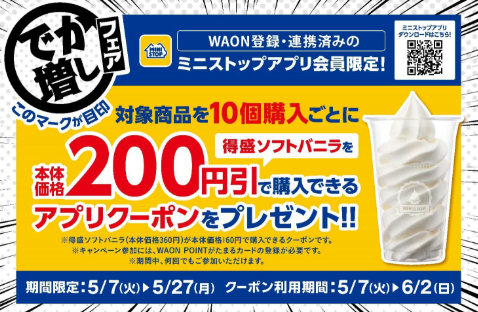 その他、5月7日(火)~5月27日(月)に「ミニストップアプリ イベント」として、でか増しフェア対象商品を10個購入ごとに「得盛ソフトバニラ」を、本体価格より200円引で購入できるアプリクーポンをプレゼントする。