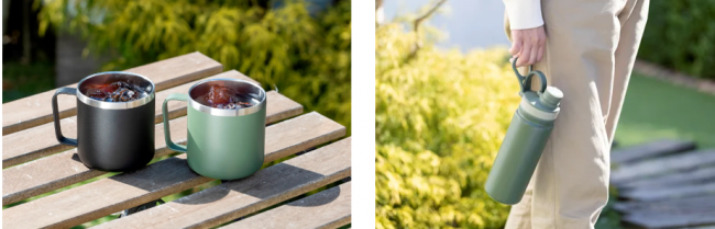 ラインアップは「蓋付きステンレス真空断熱カップ」(容量370ml、税込価格1280円)と「保冷スポーツボトル」(680ml、1480円)の2種類。色はそれぞれブラックとカーキを揃える。