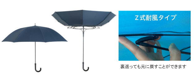 「DCM 紳士耐風傘」の特徴は、親骨の長さを主流の60㎝より大型の 68.5㎝(使用時の直径約120㎝)とし、親骨にZ式耐風タイプを採用しており、強風で裏返っても簡単に元に戻すことができる。これにより豪雨や突然の強風などの悪天候時にも、濡れにくく安心して使用できる。