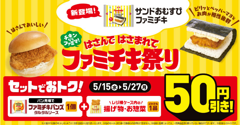 その他、キャンペーン期間中(~5月27日(月)まで)、ファミチキバンズ(タルタルソース)1個と一緒に、ファミチキをはじめとしたレジ横ケースの揚げ物や惣菜1品をセットで購入すると、その場で50円引きとなる。