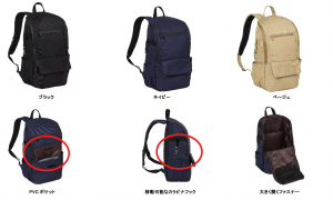 その他にも、暑い日の対策としてショルダーベルトや保冷剤が入る「背面ポケット」、水を通さない素材で、濡れものや汚れものを入れるときも便利な「底部PVCポケット」、リュック内ポケットはアルミ素材でペットボトルなどの持ち歩きに便利な「ペットボトルポケット」、小雨でも気にしないで使える「撥水生地」などの特長がある。