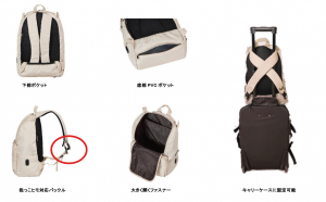 抱っこヒモを付けたままリュックを下ろすことができるバックル付きショルダーベルトが付いたリュック。左右のショルダーベルトをクロスさせればキャリーケースに固定させることもできる。カラビナ付きストラップも付いているため、パスケースを取り付けて、公共交通機関での移動の際も便利に使える。