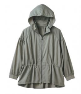 撥水、UVカット機能付き。フードは取り外し可能で、軽量。カラーはオフホワイト・イエロー・セージ・チャコール・ブラック、サイズはM・L、価格は1900円。