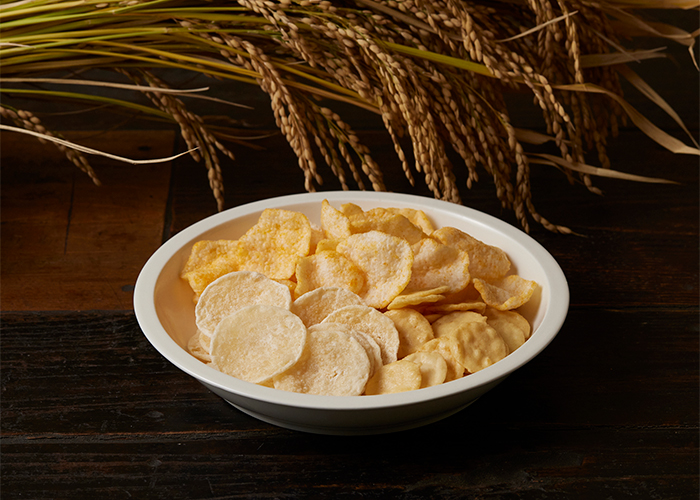 「サクッと香ばしいチップス」は炊き立てのごはんをほぐして成型して、1枚ずつスライスし、オーブンで焼いた。数日間乾燥させて、最後に油で揚げることでさくっとした食感に仕上げている。シンプルな塩味。50g250円(税込、以下同)。