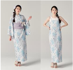 ワンピースの上に上衣を羽織るだけの、着付け要らずのセパレートタイプのゆかた。ワンピースの両サイドにはポケットが付いている。くすみ系の配色で落ち着きのある柄を採用した。ワンピースの両サイドにはポケットが付いている。くすみ系の配色で落ち着きのある柄を採用した。種類は10種類、サイズはフリー、価格は1万780円(税込み、以下同じ)。