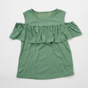 肩がチラッと見える夏らしいデザイン。無地なのでどんなボトムスとも相性が良く、コーディネートの幅も広がる。カラーはコイチャ、コイアカ、ミドリ、コイキイロ、サイズは 130cm・140cm・150cm・160cm、価格は 1078円。