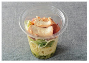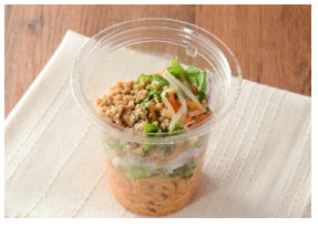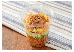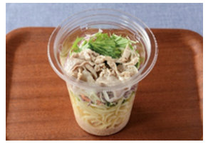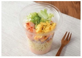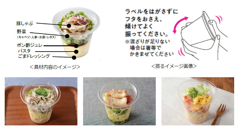 今回発売する商品は、小袋ドレッシングは添付せず、容器本体をそのまま振ることで容器下部に入れたドレッシングが具材と混ざり、手軽に食べられる仕様で、麺・野菜・肉や魚介類等を1食でバランス良く食べられる商品となる。価格は5品すべて税込み価格で397円。