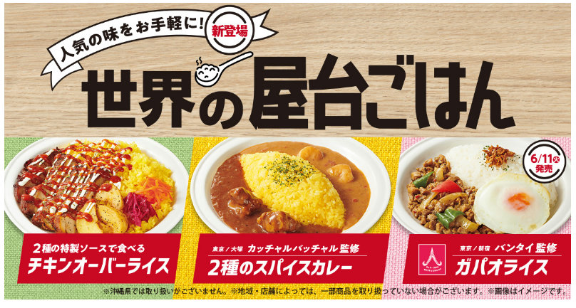 今回登場する3品は、各国を代表する屋台ごはんとなるニューヨークの「チキンオーバーライス」、インドの「カレー」、タイの「ガパオライス」を、有名店監修商品も含め発売する。