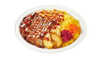 ニューヨークの屋台で定番の人気ストリートフード。イエローライスの上に、オレガノやチリパウダーなどで下味を付け焼き上げたチキンをスライスしてトッピング。サルサソースと酸味を効かせたヨーグルトソースを合わせた。本体価格は554円(以下同)。