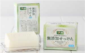 「E-WA! 天然由来 100%の無添加せっけん」は、香料・着色料・酸化防止剤・合成界面活性剤不使用の無添加せっけん。職人による昔ながらの釜炊き製法を採用しているので、天然の保湿成分が残る。洗った後、新たに保湿成分を添加する必要がなく、しっとりとした洗い上がりを実現した。また、排水後、短期間で水と二酸化炭素に生分解されるため、環境にもやさしい。