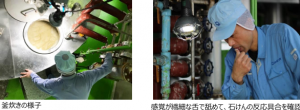 「釜炊き製法」とは、天然油脂を主原料に、加熱、かくはん、静置の工程を1週間以上かけて、じっくりと熟成させる製法。
