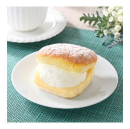 メレンゲをたっぷり使用し、じっくり火を通す湯煎焼きでふんわりくちどけの良い台湾カステラに、濃厚ですっきりとした味わいのホイップクリームをたっぷりサンドした。本体価格は276円(以下同)。発売中。