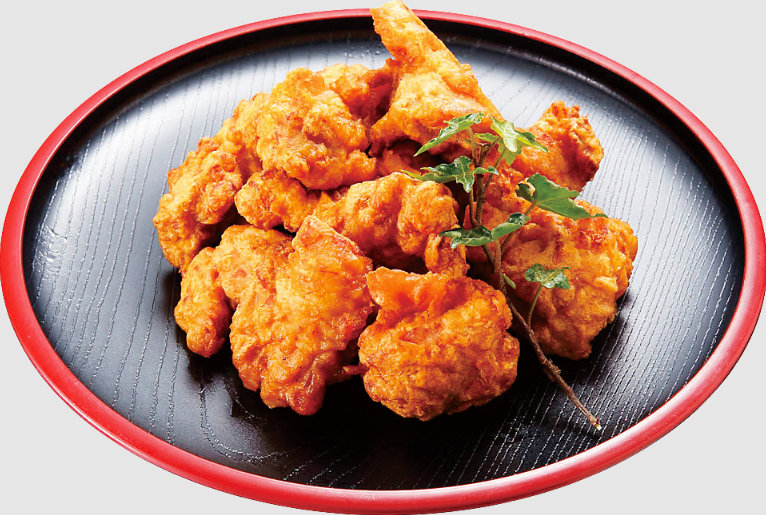 二つ目は、3種のブレンド醤油に高知県産の香り立ちの良い生姜・おろしにんにくなどを独自ブレンドした調味液で下味をつけ、バッター液には「ライフプレミアム そのまま飲んで美味しい贅沢なあご入りおだし」を加えカラッと揚げることで、だしと醤油の旨み、生姜の風味がきいた唐揚げに仕上がった。