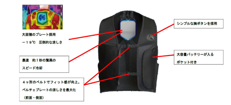 「ウィンドコア ICEペルチェベスト」は、背中に大面積のプレートを採用し、-19度の圧倒的な涼しさを最速約1秒で提供する。最先端ウェアラブルメーカーのシフトール社が開発・生産を手掛けた安心安全設計。サイズはフリーサイズ、税込価格で 1万7800円(以下同)。