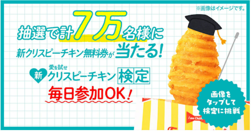 またファミリーマートでは、公式Xをフォローし「新クリスピーチキン検定」に参加すると、抽選で7万名に「クリスピーチキン プレーン」無料券をプレゼントするキャンペーンを実施する。キャンペーン期間は6月25日(火)~7月1日(月)、クーポン利用期間は6月25日(火)~7月15日(月)となる。