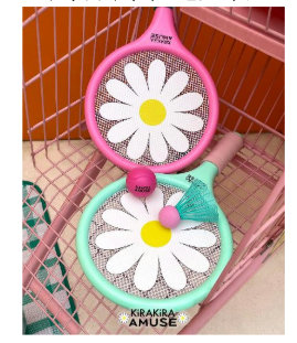 ラケット2個とボール1個、バトミントン羽1個のセット。カラーはピンク×グリーン。価格は1100円。