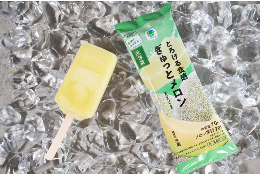 「とろける食感ぎゅっとメロン」は、北海道産青肉メロン果汁を20%使用した風味豊かなメロンアイスバー。北海道産青肉メロンのストレートピューレのみを使用し、メロン本来の甘味や芳醇な風味を活かしたアイスバーに仕上っている。表面はやや甘めの濃厚な味わい、内側は口どけが良い層に仕立てており、2種類の味わいと食感が楽しめる。