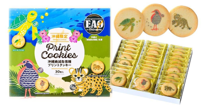 「EAO 沖縄絶滅危惧種プリントクッキー」はお土産に最適な絶滅危惧種のイラストをプリントした個包装のクッキー。30枚入りで1500円で販売する。