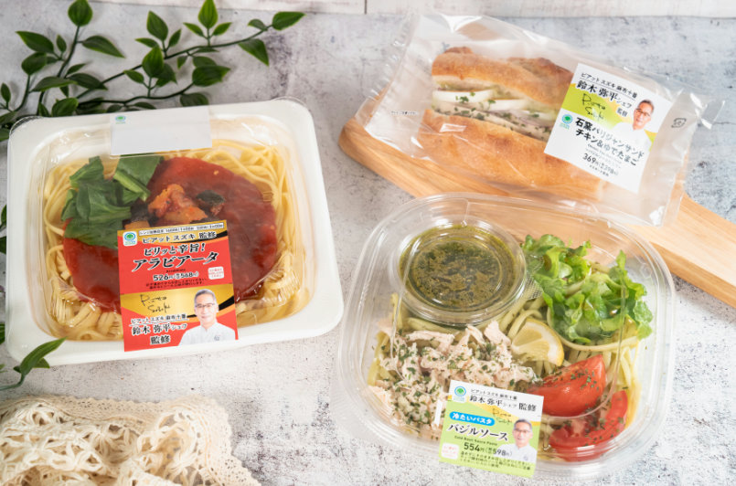 港区麻布十番の人気イタリア料理店「ピアット スズキ」は、ミシュランで14年連続星を獲得した名店だ。伝統的なイタリア料理を基本に、革新的な技術を融合した料理を提供する鈴木弥平オーナーシェフとの初監修商品として、「ピリッと辛旨!アラビアータ」、「冷たいパスタ バジルソース」、「石窯パリジャンサンド チキン&ゆでたまご~バジルソース仕立て~」を発売する。